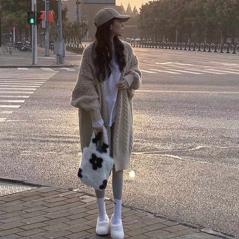 ニット カーディガン オーバーサイズ 厚手 ロング トップス ニットソー カーディガン 上着 袖あり 長袖 ドルマンスリーブ 襟なし ワイド もこもこ モコモコ 前開き 編み込み ニット かわいい